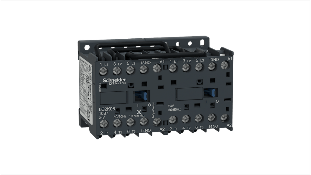 Teleinvertore reversibile Schneider Electric, serie LC2K, 3 poli, 3 NA, 6 A, 3 kW, bobina 24 V c.a., tensione nominale contatto 600 V c.a., temperatura operativa -25 a +50 gradi Celsius, morsetti a vite, montaggio su guida DIN, dimensioni 73.15 mm x 90 mm x 56.8 mm, conforme a IEC 60947, certificato UL e CSA.