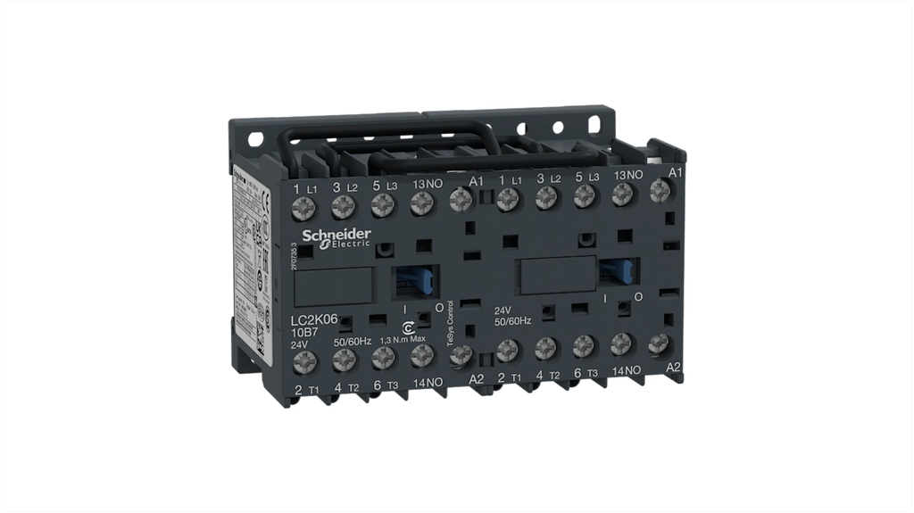 Teleinvertore Reversibile Schneider Electric, serie LC2K, 3 poli, 3 NA, 6 A, 3 kW, bobina 48 V c.a. Tensione nominale contatto 690 V c.a., corrente nominale 6 A, potenza nominale 3 kW, temperatura operativa da -25 a +50 gradi Celsius, montaggio su guida DIN, morsetti a vite, conforme a IEC 60947. Dimensioni: 58 mm x 90 mm x 57 mm. Certificato UL, CSA.