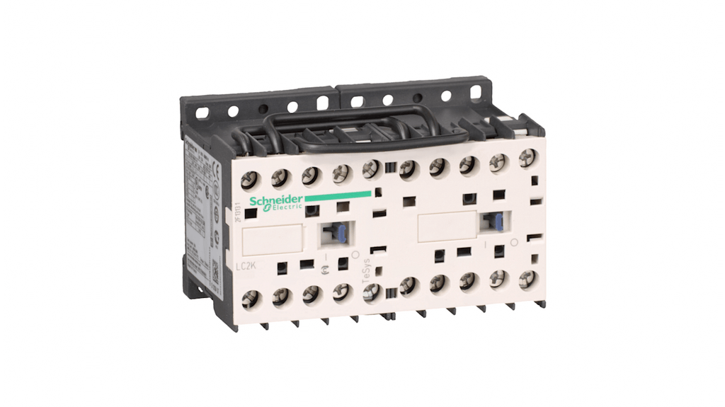 Teleinvertore Reversibile Schneider Electric, serie LC2K, 4 poli, 1 NA + 1 NC, 9 A. Progettato per applicazioni elettriche domestiche e HVAC, operante fino a 3600 cicli all'ora, temperatura ambiente fino a 60 gradi Celsius. Montaggio su guida DIN o fissaggio a vite, interblocco meccanico, compatto e di alta affidabilità.