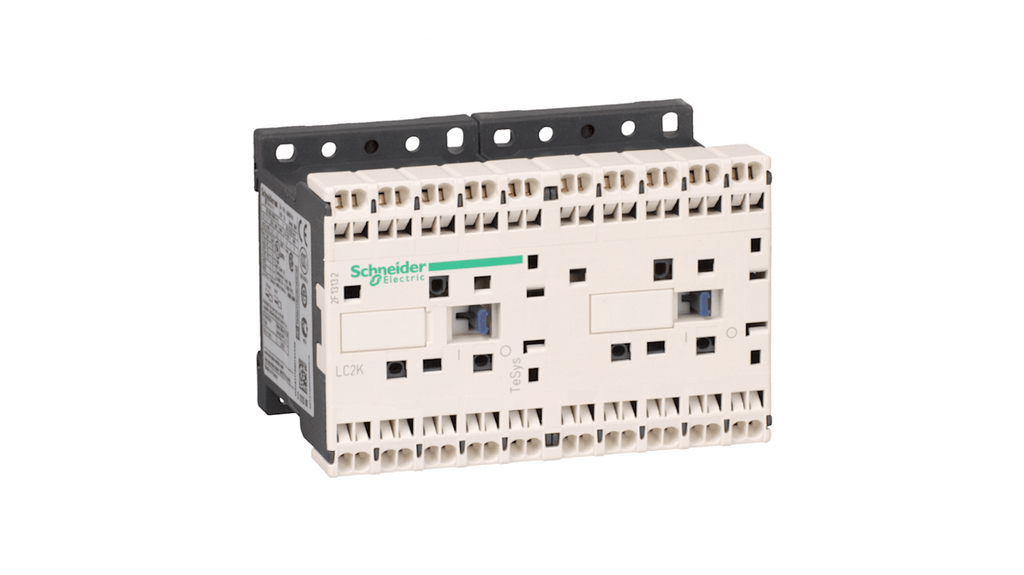 Teleinvertore Reversibile Schneider Electric, serie LC2K, 3 poli, 1 NA + 1 NC, 9 A, bobina 230 V. Progettato per applicazioni elettriche domestiche e HVAC, velocità di funzionamento fino a 3600 cicli all'ora, temperatura ambiente fino a 60 °C, montaggio su guida DIN o fissaggio a vite, interblocco meccanico, facile installazione con viti multi-standard.