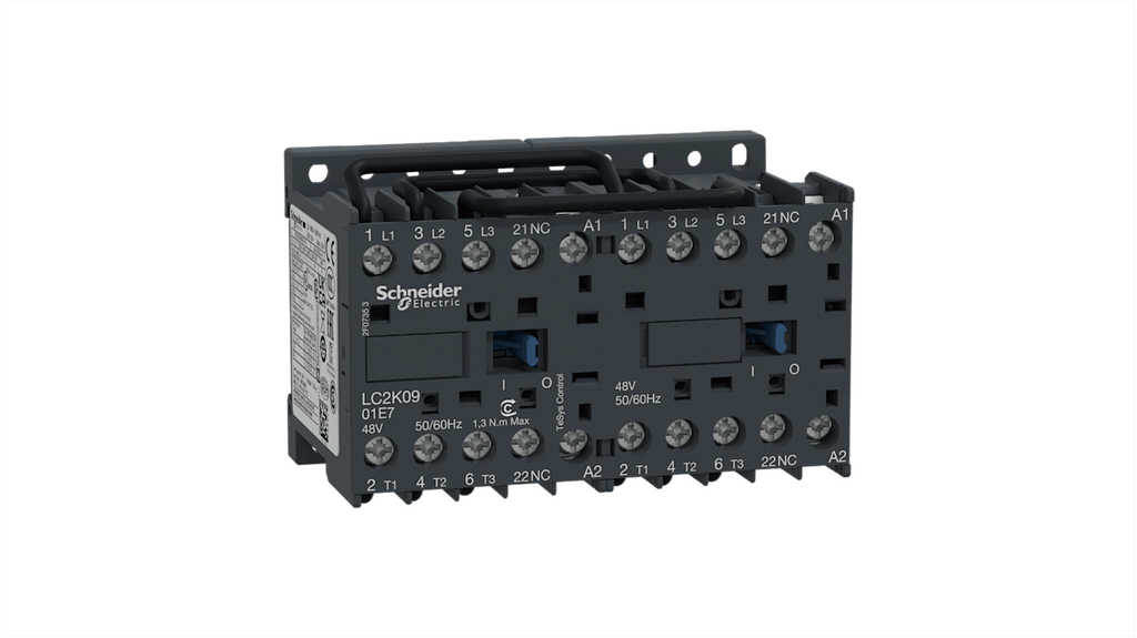 Teleinvertore Reversibile Schneider Electric, serie LC2K, 3 poli, 3 NA, 9 A, 4 kW, bobina 230 V ca. Tensione nominale contatto 690 V c.a., corrente nominale 9 A, potenza nominale 4 kW, morsetti a vite, montaggio su guida DIN, dimensioni 90 mm x 58 mm x 57 mm, conforme a IEC 60947. Applicazioni in industria, infrastrutture ed edilizia.