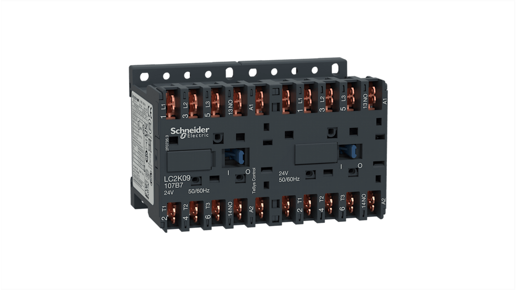 Teleinvertore reversibile Schneider Electric, serie LC2K, 3 poli, 1NC, 9 A, 4 kW, bobina 24 V c.a., tensione nominale contatto 600 V c.a., potenza nominale 4 kW, dimensioni 58 mm x 90 mm x 57 mm, temperatura operativa da -25 a +50 gradi Celsius, montaggio su guida DIN, terminali a vite, conforme a IEC 60947, categoria di sovratensione III.