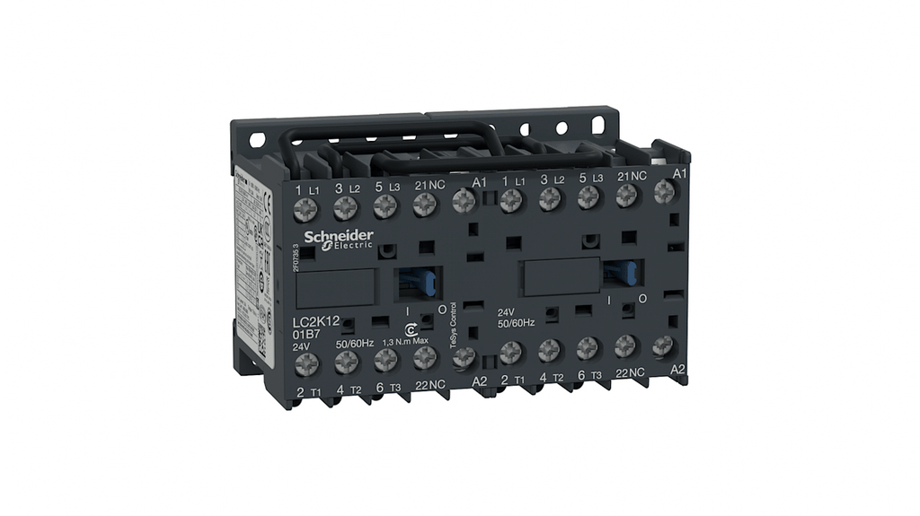 Contattore reversibile per motori, Schneider Electric LC2K1201P7, 3 poli, 3NO, corrente nominale 20 A, potenza nominale 5,5 kW, tensione bobina 230 V c.a., tensione nominale contatto 690 V c.a., temperatura operativa da -25 a +50 gradi, dimensioni 90 mm x 58 mm x 57 mm, configurazione contatti ausiliari 1NC, tipo terminale cavo.