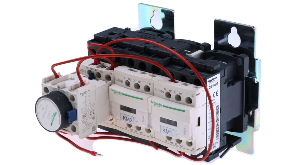 Motorino di avviamento Stella/Triangolo per motori con rotore a gabbia, potenza nominale 22 kW, tensione 24 V c.a., montato su struttura a telaio aperto, frequenza massima 30 avvii/ora, ritardo di avviamento 30 secondi, dispositivo di blocco meccanico, contatto ausiliario 1N/C, dimensioni 124 mm x 144 mm x 139 mm, serie LC3D.