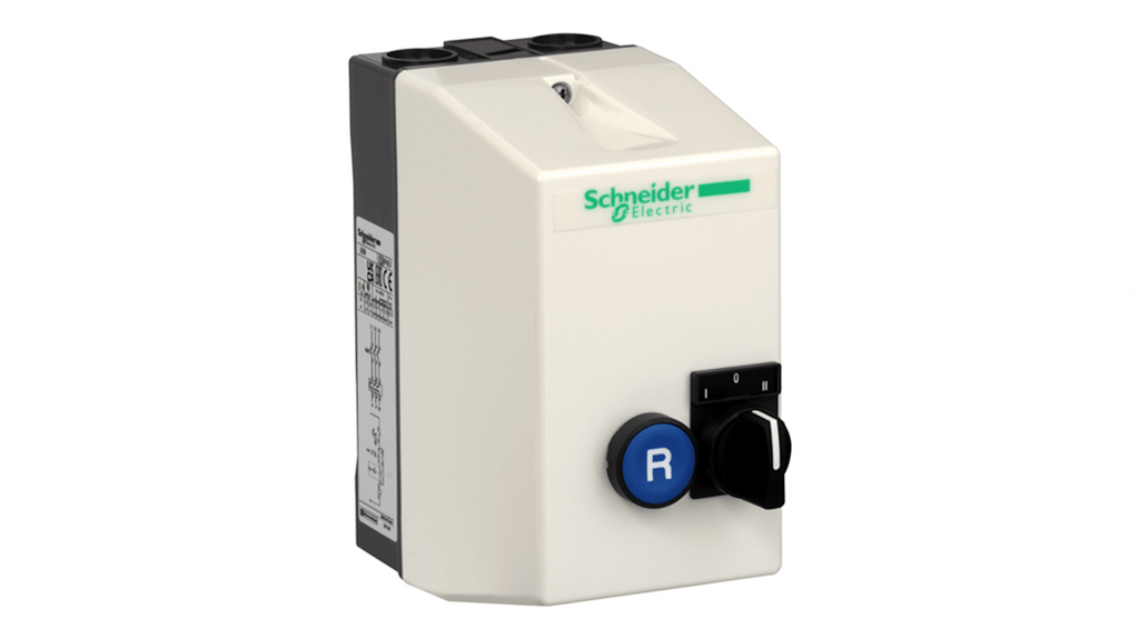 Avviatore DOL per motori fino a 4 kW, tensione nominale 440 V, corrente nominale 9 A, grado di protezione IP65, design compatto in policarbonato, selettore per avvio automatico/arresto/avvio manuale, comando a pulsante di ripristino, relè termico di sovraccarico ordinabile separatamente, conforme a Reach e RoHS, stato di prodotto Green Premium. Codice costruttore LE1D09V7A09, marchio Schneider Electric.