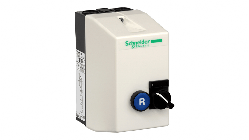 Avviatore DOL chiuso per motori, potenza nominale 3 kW, tensione 400 V, corrente nominale 12 A, grado di protezione IP65 e IK07, conforme agli standard IEC, include interruttore a 2 posizioni e pulsante di reset, progettato per applicazioni AC-3, stato di prodotto Green Premium per la sostenibilità. Codice costruttore LE1D12V7A13, marchio Schneider Electric.
