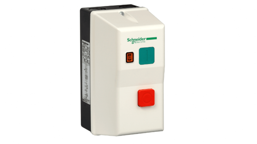 Starter DOL manuale per motori non reversibili, potenza nominale 1,5 kW, tensione 220 V c.a., 3 fasi, corrente nominale 3,7 A, 3 poli. Contattore e relè di sovraccarico termico, contenitore in ABS autoestinguente, grado di protezione IP65, montaggio superficiale con fissaggio a vite, 2 fori per pressacavi superiori e inferiori. Codice costruttore LE1M35M710, marchio Schneider Electric.