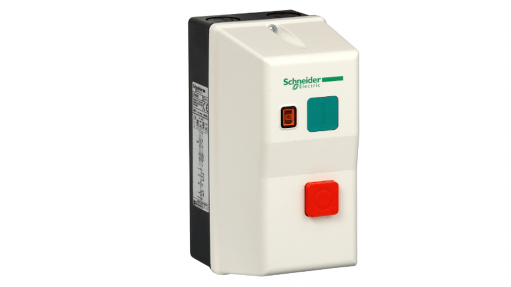 Starter DOL manuale per motori, potenza nominale 2,2 kW, tensione 220 V c.a., 3 fasi, corrente nominale 5,5 A, grado di protezione IP65. Contenitore in ABS autoestinguente, montaggio superficiale con fissaggio a vite, pulsante verde Start, pulsante rosso Stop/Reset, indicatore di funzionamento giallo. Include relè di sovraccarico termico e contattore, circuito di controllo 230V 50/60Hz, da cablare al cliente.
