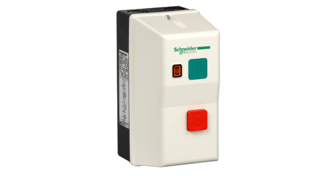 Starter DOL manuale per motori non reversibili, potenza nominale 5,5 kW, tensione 380 V c.a., 3 poli, corrente nominale 14 A, grado di protezione IP65. Contenitore in materiale ABS autoestinguente, montaggio superficiale con fissaggio a vite, 2 fori per pressacavi. Include relè di sovraccarico termico LR2K e contattore LC1K, circuito di controllo precablato 380V 50/60Hz. Codice costruttore LE1M35Q721, marchio Schneider Electric.