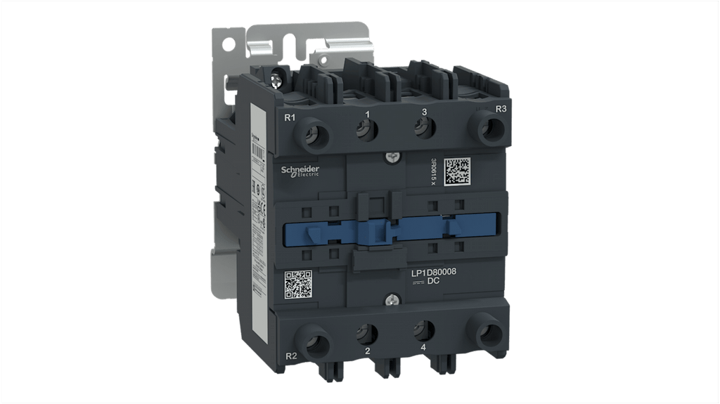 Contattore per motori Schneider Electric, serie LP1D, 4 poli, 2 NO + 2 NC, corrente nominale 125 A, tensione bobina 230 V c.c., dimensioni 96 mm x 127 mm x 125 mm, temperatura operativa da -5°C a +60°C, tipo terminale cavo, range TeSys D. Codice costruttore LP1D80008MD.