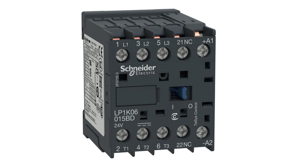 Contattore Schneider Electric, 3 poli, 3NO, 6 A, 3 kW, bobina 24 V c.c., tensione nominale contatto 690 V c.a., capacità di interruzione nominale 110 A, 1 contatto ausiliario NC, serie TeSys K, codice LP1K06015BD, profondità 57 mm, terminali a pin saldare. Resistenza al fuoco, non ignifugo. Applicazioni: ascensori, sistemi HVAC, compressori ad alta pressione.