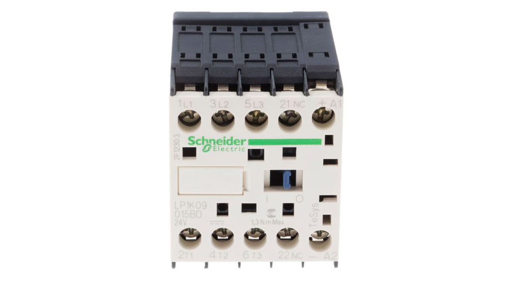 Contattore Schneider Electric, serie LP1K, 3 poli, 3 NA, 9 A, bobina 24 V dc. Tensione nominale contatto 690 V ac, corrente nominale contatto 9 A, configurazione contatti ausiliari 1 NC, tipo terminale vite. Dimensioni: larghezza 45 mm, lunghezza 58 mm, profondità 57 mm. Conforme a standard CSA, UL, NEMKO, DEMKO, SEMKO, FIMKO, BS5424 Parte 1/IEC 947, VDE 0660, NFC63 110.