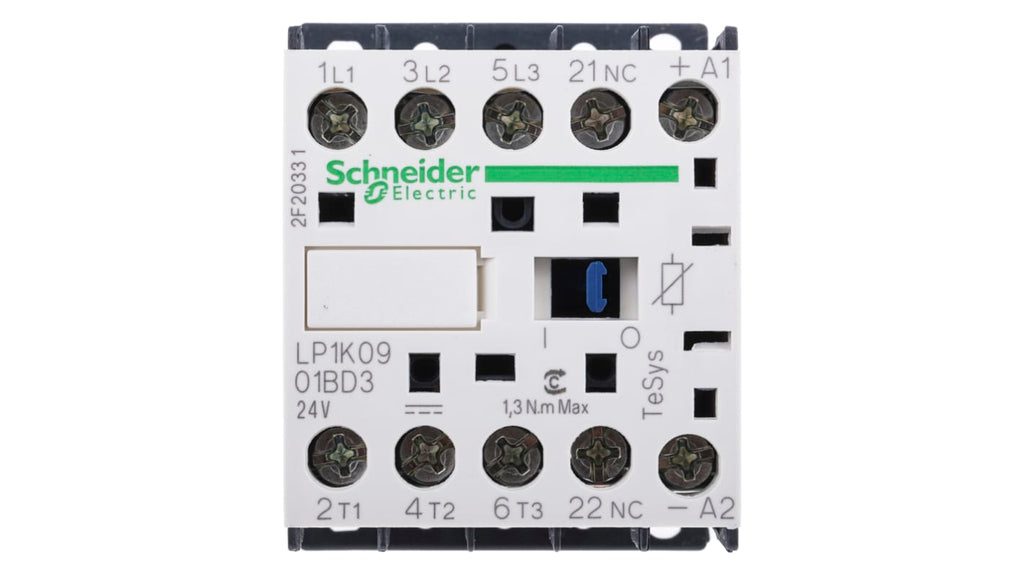 Contattore a 3 poli Schneider Electric, tensione bobina 24 V dc, corrente nominale 9 A, potenza nominale 4 kW, grado di protezione IP20, temperatura operativa da -25 a +50 gradi Celsius, dimensioni 45 mm x 58 mm x 57 mm, peso 235 g, configurazione 3 NA, 1 NC, terminali a vite. Codice costruttore LP1K0901BD3, serie LP1K.
