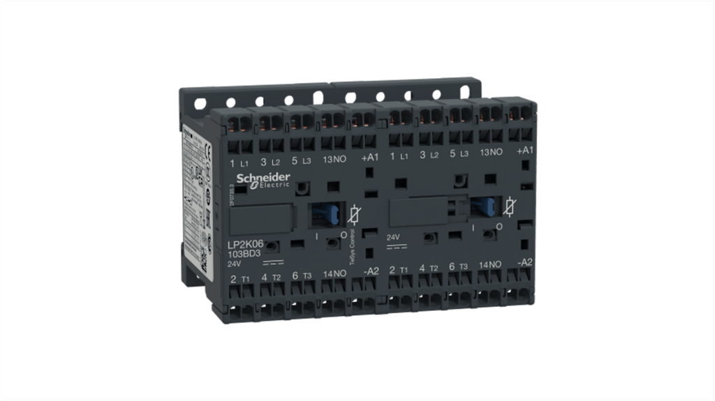 Contattore di inversione Schneider Electric, 3 poli, 1 NA + 1 NC, corrente nominale 6 A, serie LP2K, per applicazioni di controllo motore. Velocità di funzionamento fino a 600 cicli all'ora in AC-3, temperatura ambiente fino a 50 gradi Celsius. Montaggio su guida DIN o fissaggio a vite, interblocco meccanico, senza collegamenti di alimentazione di inversione precablati. Compatto, morsetti a molla.