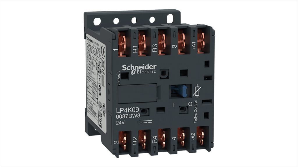 Contattore per motori a 4 poli, 2 NO + 2 NC, corrente nominale 20 A, tensione bobina 24 V c.c., tensione nominale contatto 690 V c.a., connettore Faston, dimensioni 58 mm x 45 mm x 57 mm, temperatura operativa da -25°C a +50°C, serie TeSys K, codice costruttore LP4K090087BW3, marchio Schneider Electric.