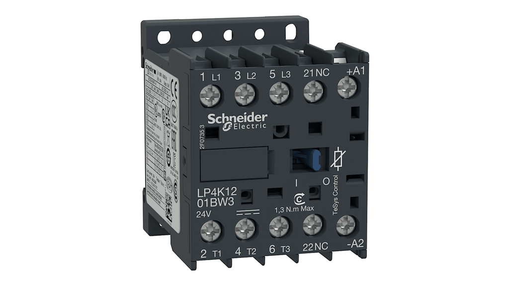 Contattore per motori Schneider Electric, serie LP4K, 3 poli, 3NO, corrente nominale 20 A, potenza nominale 5,5 kW, tensione bobina 48 V c.c., tensione nominale contatto 690 V c.a., configurazione contatti ausiliari 1NC, dimensioni 58 mm x 45 mm x 57 mm, temperatura operativa da -25°C a +50°C. Codice costruttore LP4K1201EW3.