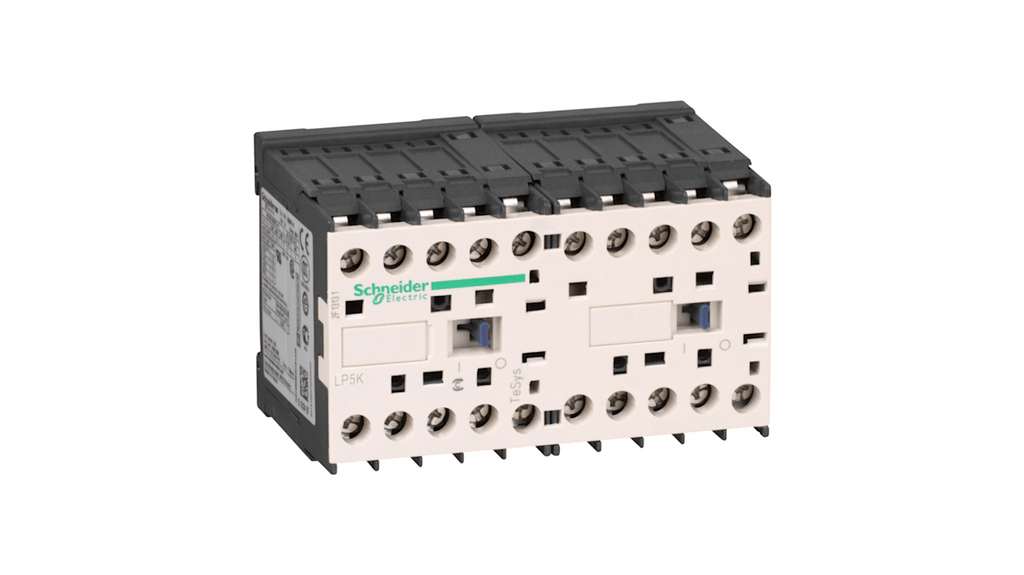 Teleinvertore Reversibile Schneider Electric, serie LP5K, 3 poli, 1 NA + 1 NC, 12 A. Contattore a inversione per controllo motore, compatto, montaggio su guida DIN o fissaggio a vite, interblocco meccanico, collegamenti di alimentazione precablati, conforme a Green Premium. Corrente nominale 12 A, configurazione 1 NA + 1 NC.