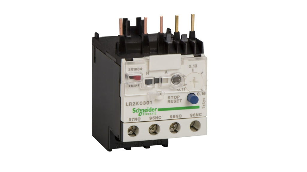 Relè di sovraccarico Schneider Electric, 1 NO + 1 NC, carico FLC 0,54 a 0,8 A, corrente nominale contatto 10 A, potenza nominale 0,002 kW, tensione di controllo 250 V c.c., temperatura operativa da -20 a 55 gradi Celsius, grado di protezione IP2x, morsetti a vite, progettato per protezione motore. Codice costruttore LR2K0305.