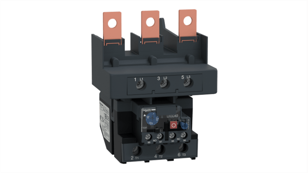 Relè di sovraccarico termico Schneider Electric, progettato per proteggere circuiti c.a. e motori dai sovraccarichi, configurazione 1 NA + 1 NC, carico FLC 95 a 120 A, corrente nominale contatto 5 A, quadrante di regolazione termica, selettore di reset manuale-automatico, selettore di test, indicatore a bandiera, impostazioni protette da coperchio trasparente bloccabile. Codice costruttore LR3D4367.