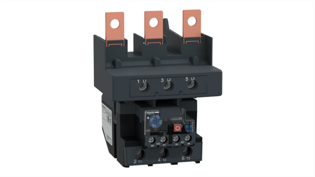 Relè di sovraccarico termico Schneider Electric, progettato per proteggere circuiti c.a. e motori dai sovraccarichi, configurazione 1 NA + 1 NC, carico FLC 110 a 140 A, corrente nominale contatto 5 A, quadrante di regolazione termica, selettore di reset manuale-automatico, selettore di test, indicatore a bandiera, impostazioni protette da coperchio trasparente bloccabile.