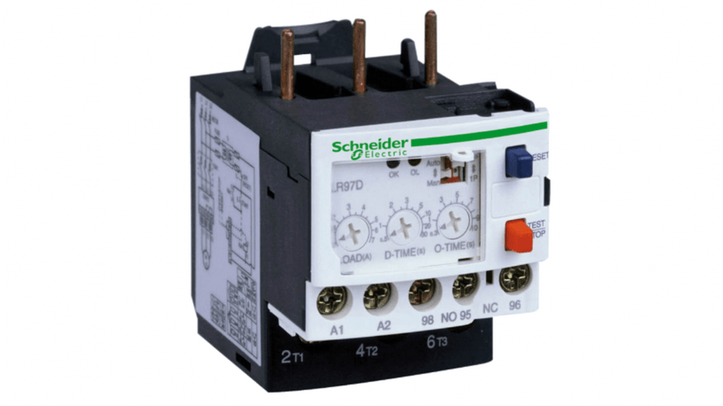 Relè di sovraccarico elettronico per motori, corrente nominale 5-25 A, tensione 690 V, potenza nominale 0,055 kW, tensione di controllo 24 V c.c., selettori per sovracorrente, durata sovracorrente e durata di avviamento, certificazione multi-standard IEC, UL, CSA, CCC, EAC, conformità RoHS/REACH, impostazioni bloccabili con coperchio trasparente. Codice costruttore LR97D25M7, marchio Schneider Electric.