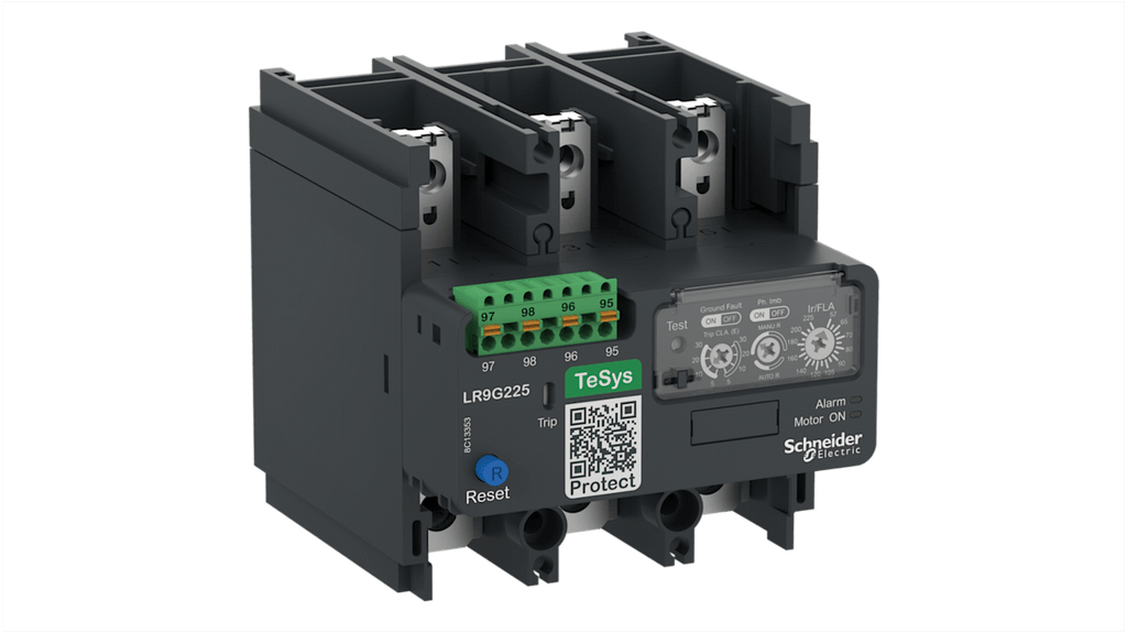 Relè di sovraccarico termico Schneider Electric, 1 NA + 1 NC, carico FLC 28 a 115 A, tensione di controllo 24 a 250 V c.c., protezioni per squilibrio di fase, perdita di fase e guasto di messa a terra, immunità alla compatibilità elettromagnetica conforme a IEC 60947-4-1, terminali a innesto, LED indicatore di attivazione, opzioni di reset manuale e automatico, durata meccanica 7000 cicli, classe di sovraccarico termico DA 5e a 30E.