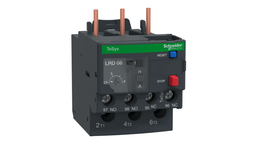 Relè di sovraccarico termico Schneider Electric, 1 NA + 1 NC, carico FLC 2,4 a 4 A, corrente nominale contatto 5 A, progettato per contattori TeSys D. Include pulsanti di test e reset manuali, reset automatico, contatto ausiliario di attivazione, indicatore di flag. Temperatura compensata per precisione nella protezione. Compatto e leggero.