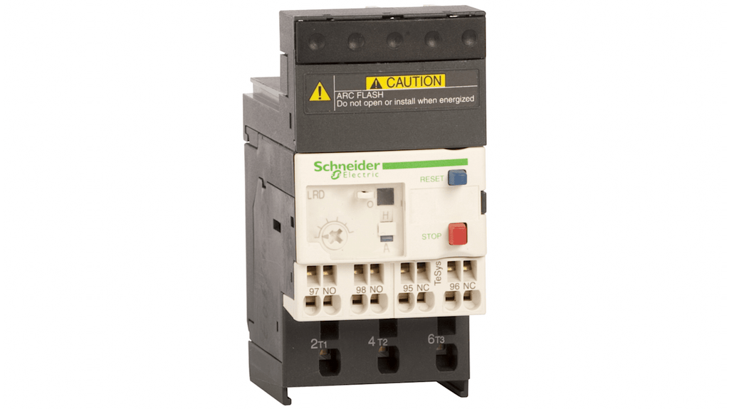 Relè di sovraccarico termico Schneider Electric, 1 NA + 1 NC, carico FLC 7 a 10 A, corrente nominale contatto 5 A, quadrante di regolazione termica, selettore di reset manuale-automatico, selettore di prova, indicatore a bandiera, 2 contatti ausiliari, collegamento tramite morsetti a vite, installazione semplificata, coperchio trasparente bloccabile. Codice costruttore LRD143.