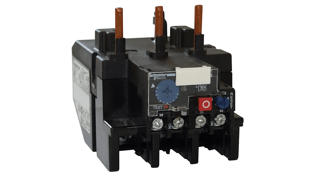 Relè di sovraccarico termico Schneider Electric, 1 NA + 1 NC, montaggio su guida DIN o fissaggio a vite, quadrante di regolazione termica, selettore di reset manuale-automatico, pulsante di prova di attivazione, pulsante di arresto, indicatore a bandiera, reset remoto senza apertura pannello, indicatore di attivazione del relè, compatibile con TeSys. Codice costruttore: LRD3359A66.