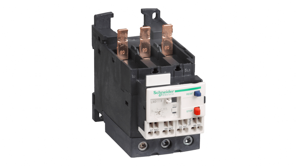 Relè di sovraccarico termico Schneider Electric, progettato per proteggere circuiti c.a. e motori dai sovraccarichi, configurazione 1 NA + 1 NC, carico FLC 37 a 50 A, corrente nominale contatto 10 A, quadrante di regolazione termica, selettore di reset manuale-automatico, selettore di test, indicatore a bandiera, impostazioni protette da coperchio trasparente bloccabile. Codice costruttore LRD3503.