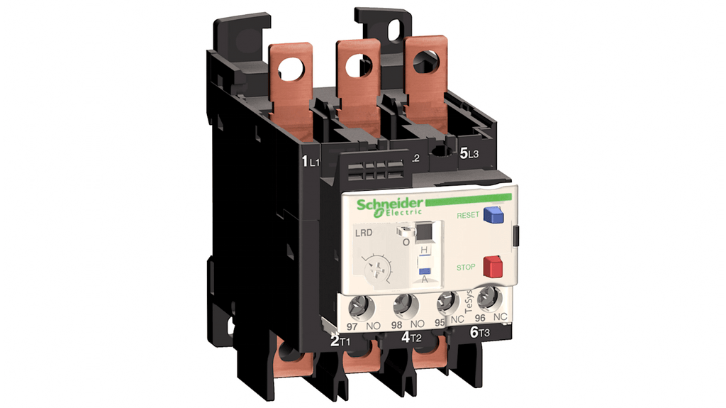 Relè di sovraccarico termico per protezione circuiti c.a. e motori, 1 NA + 1 NC, carico FLC 48 a 65 A, corrente nominale contatto 5 A, quadrante di regolazione termica, selettore di reset manuale-automatico, selettore di test, indicatore a bandiera, impostazioni protette da coperchio trasparente bloccabile. Installazione facilitata con viti multi-standard. Marchio: Schneider Electric, codice costruttore: LRD365L6.