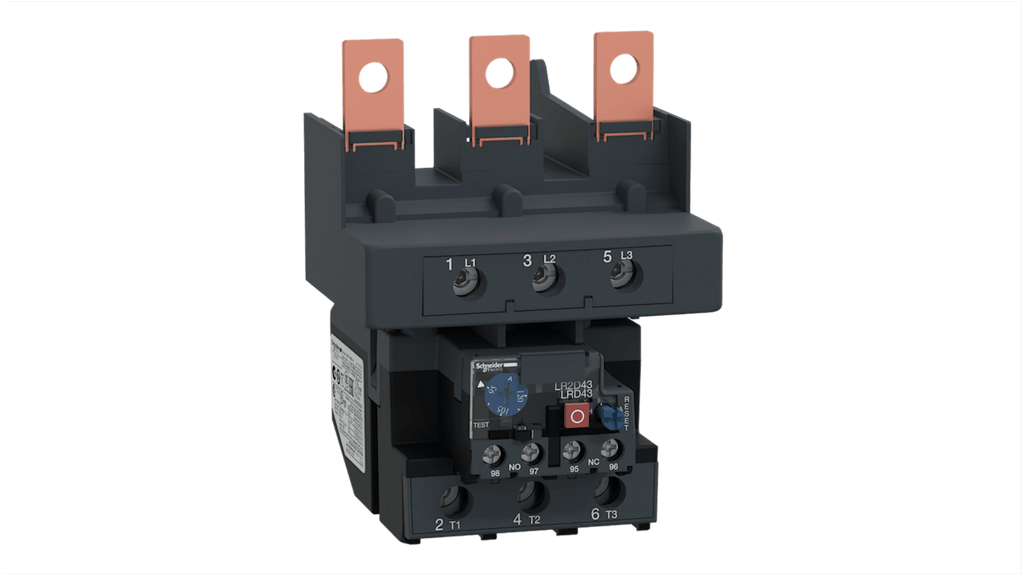 Relè di sovraccarico termico tripolari, corrente nominale 95 a 120 A, tensione di isolamento 600 V, tensione massima applicabile 6 kV, range di temperatura operativa -20 a +60 C, montaggio diretto sotto a contattori tripolari o su guida DIN, quadrante di impostazione regolabile, pulsante di verifica, pulsante di arresto, ripristino manuale/automatico, indicatore innesco, contatti ausiliari 1N/A + 1N/C, copertura sigillabile.