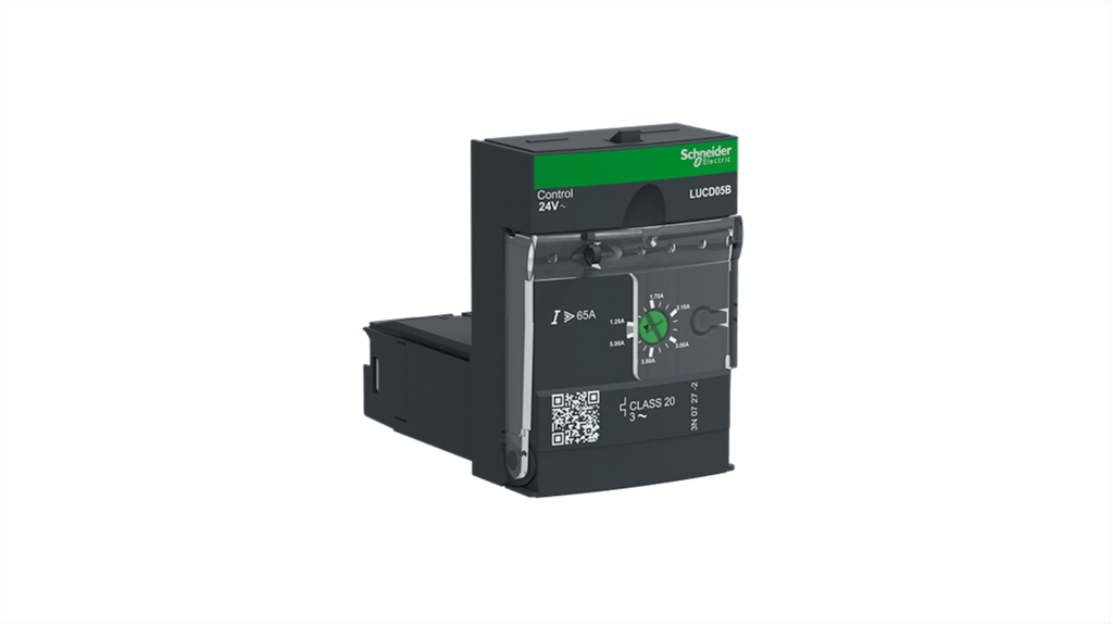 Controller motore, 3 fasi, 1,5 kW, 690 V, IP20. Potenza nominale 1,5 kW, tensione nominale 690 V, corrente nominale 5 A, grado di protezione IP20. Include protezione da sovraccarico, cortocircuito, mancanza di fase e squilibrio di fase, reset manuale, sovraccarico termico di classe 20, protezione contro guasti a terra. Marchio Schneider Electric, codice LUCD05B.