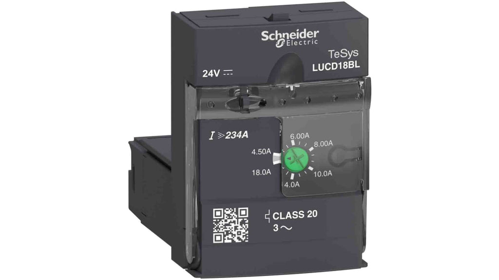Starter motore avanzato, trifase, potenza nominale 15 kW, classe 20. Unità di controllo elettronica, protezione contro sovraccarichi, corto circuiti, guasto di fase e squilibrio di fase. Moduli ad innesto per personalizzazione, larghezza 45 mm, compatibile con basi di alimentazione 12 A o 32 A. Diagnostica plug-and-play espandibile, progettazione salvaspazio, assemblaggio rapido. Marchio Schneider Electric, serie TeSys U.