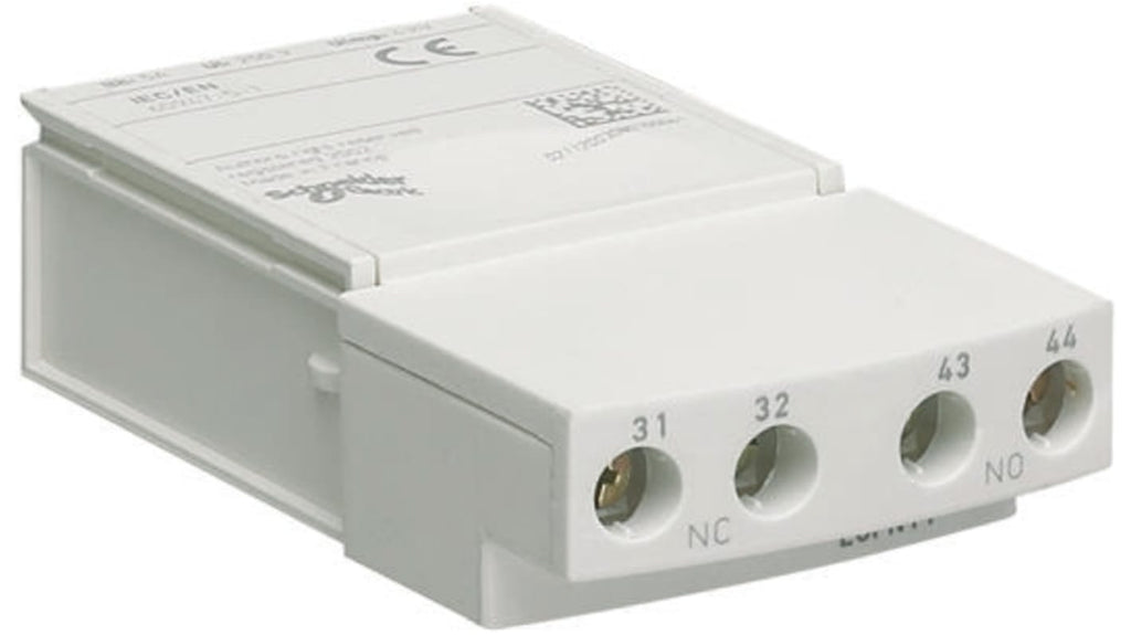 Modulo di contatto ausiliario, 2 N/C, serie LUFN, corrente nominale 5 A, tensione nominale 24-250 V c.a./c.c., compatibile con qualsiasi base di alimentazione, progettato per indicare lo stato del dispositivo di avviamento. Dimensioni 45 mm, costruzione modulare per assemblaggio rapido, flessibile e aggiornabile con moduli plug-and-play. Disponibile in colori bianco o nero.