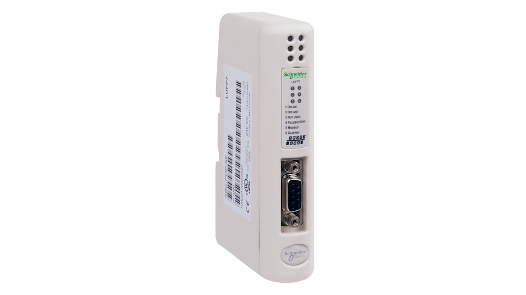 Modulo di comunicazione per Starter-controller ATS48, ATV31, TeSys U. Gateway DeviceNet/Modbus, compatibile con 8 slave Modbus. Connessione tramite bus di campo con connettore a vite a 5 vie e RJ45. Temperatura ambiente per installazione da 5 a 50 gradi Celsius. Grado di protezione IP20. Marchio Schneider Electric, serie LUF, codice LUFP9.