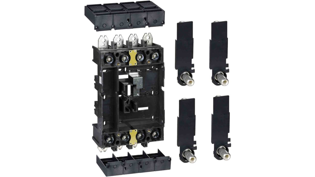 Kit a innesto per interruttori automatici fissi NSX 100/160/250, configurazione a innesto per installazione rapida, include base a innesto, 4 collegamenti di alimentazione, 2 schermature terminali corte, interblocco di sicurezza, modalità di montaggio a innesto, privo di mercurio. Compatibile con dispositivi NSX compatti fissi.