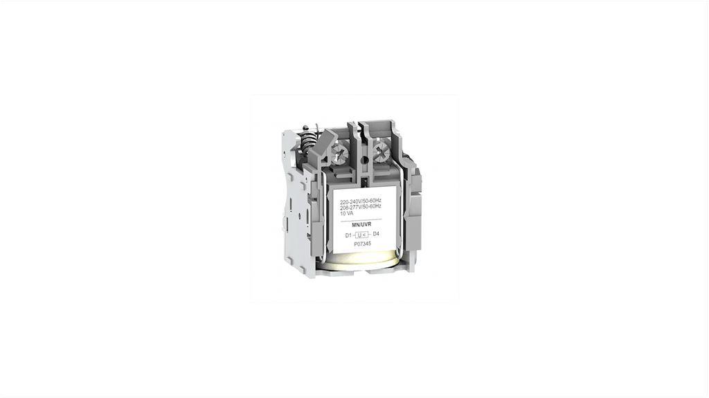 Interruttore magnetotermico scatolato per rilascio di sottotensione, tensione nominale 24VDC, tempo di risposta 50ms, conforme allo standard IEC 60947-2, certificato UL/CSA. Accessorio per interruttori automatici Compact NSX, PowerPACT Multisandard e Easypact CVS, apre l'interruttore quando la tensione di controllo scende sotto il 35% della tensione nominale, elimina disturbi di attivazione da cali di tensione transitori.