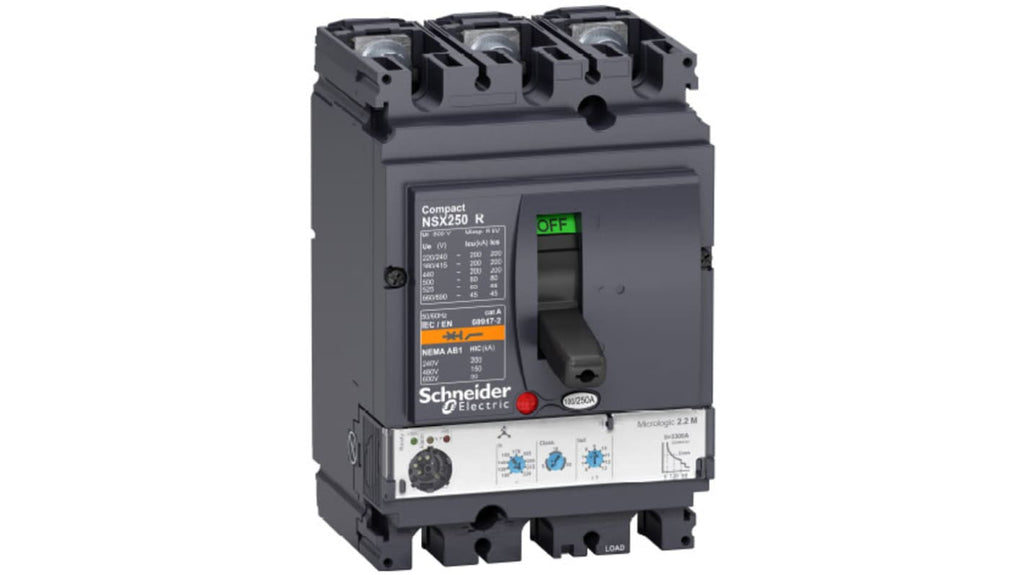 Interruttore automatico fisso 3 poli, 160A, progettato per ottimizzare spazio e capacità di interruzione. Capacità di interruzione 200kA a 415VAC, 45kA a 690VAC, tensione di esercizio 690VAC. Grado di protezione IP40, IK07, grado di inquinamento 3. Montaggio fisso, compatto, serie LV43. Unità di intervento elettronica Micrologic 2.2.