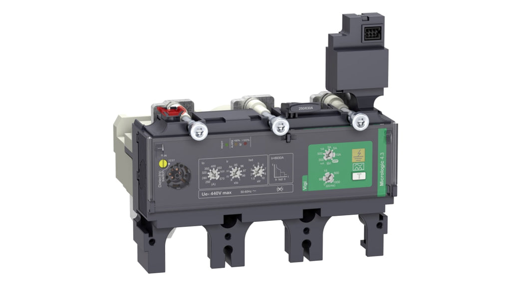 Interruttore magnetotermico scatolato, unità di attivazione elettronica 3d a 3 poli, corrente nominale 570 A, classe di protezione A, protezione contro le perdite di terra regolabile, temperatura di funzionamento da -25 a 70 gradi Celsius, grado di protezione IP40, compatibile con interruttori automatici compatti NSX 400/630, marchio Schneider Electric, codice costruttore LV433931.