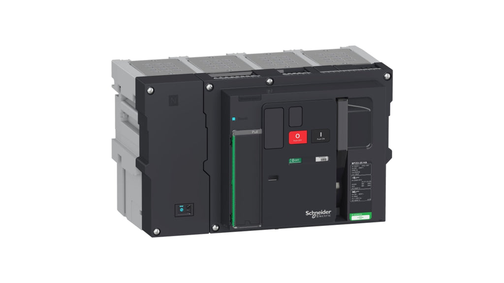 Sezionatore con interruttore Schneider Electric serie MTZ2, 4 poli, corrente massima 2500 A, tensione d'esercizio 690 V c.a., temperatura operativa -25 a 70 C, grado di protezione IP30, controllato tramite pulsante. Modello Masterpact MTZ2 25 HA.
