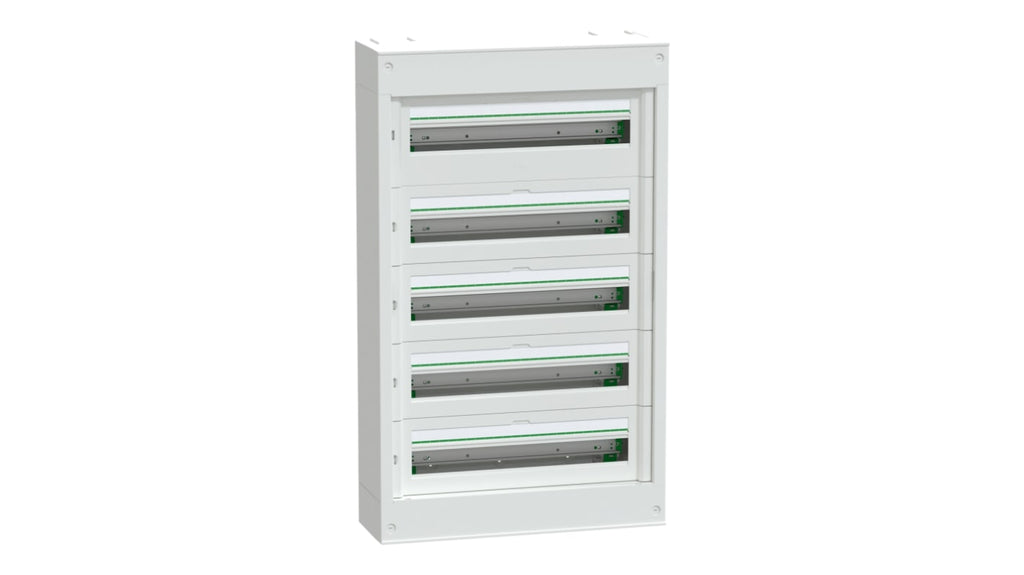 Contenitore modulare a montaggio superficiale, 5 fori, capacità totale di 120 moduli a 18 mm, dimensioni 570 mm x 956 mm x 191 mm, materiale plastico, colore bianco, grado di protezione IP30 e IP41, classe di isolamento elettrico Classe II, completo di morsetto di messa a terra, conforme a RoHS, senza alogeni, senza mercurio, senza metalli pesanti tossici, prodotto verde Premium.