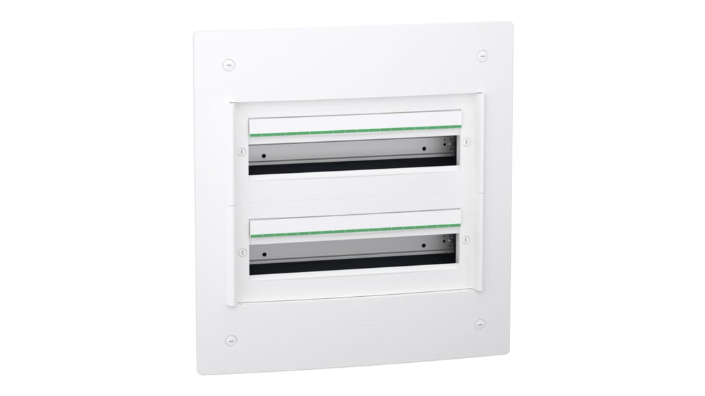 Contenitore di distribuzione PrismaSeT XS, montaggio a filo, 2 fori, 2 file di 18 moduli da 18 mm, materiale plastico, colore bianco RAL 9003, grado di protezione IP40 con porta, IP30 senza porta, grado di protezione IK08 senza sportello, IK09 con sportello, temperatura d'esercizio -25 °C a 60 °C, installazione interna, cavi inseribili superiormente o inferiormente tramite piastre di ingresso cavo rimovibili.
