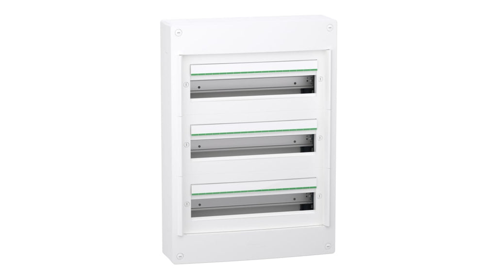 Contenitore modulare a montaggio superficiale, 3 fori, 54 moduli totali, 3 file orizzontali da 18 moduli ciascuna, classe di isolamento elettrico II, grado di protezione IK08 e IK09, grado di protezione IP30 e IP40, materiale plastico, colore bianco, conforme a RoHS, senza mercurio, senza metalli pesanti tossici.
