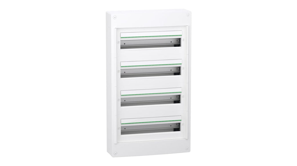 Contenitore modulare per montaggio superficiale, 4 fori, 72 moduli totali, 18 mm per fila, classe di isolamento elettrico II, grado di protezione IK08 e IK09, grado di protezione IP30 e IP40, materiale plastico, colore bianco, conforme a RoHS, senza mercurio e metalli pesanti tossici, include 1 morsetto di messa a terra, 1 neutro e 1 fase senza sportello. Codice costruttore LVSXT418.