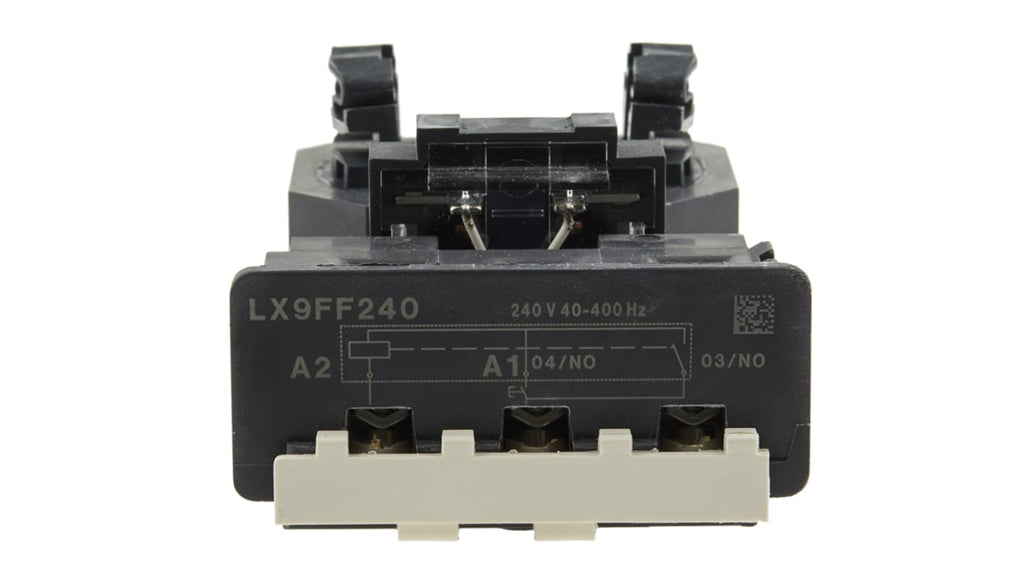 Bobina contattore per uso con LC1F115 e LC1F150, tensione nominale 240 V c.a., resistenza media 73,5 ohm a 68°F, induttanza 9,68H, tempo di chiusura 35 ms, tempo di apertura 130 ms, dissipazione calore 5,9W a 7,2W, durata meccanica 10 milioni di cicli, senza modulo soppressore. Certificazioni: ABS, BV, CB, CSA, DNV, RINA, UL. Serie LX9F, marchio Schneider Electric.