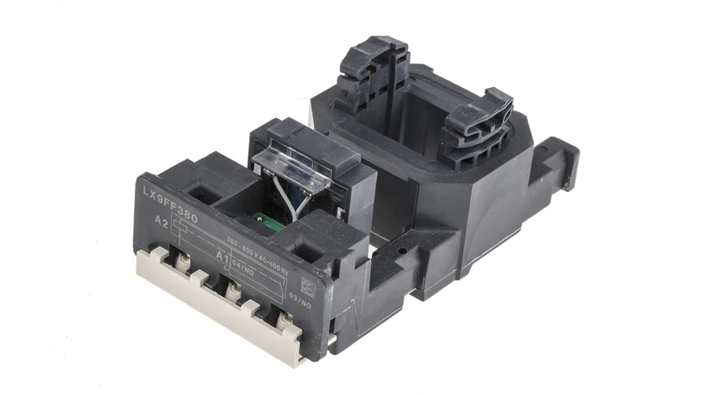 Bobina contattore per uso con LC1F115 e LC1F150, tensione nominale 380 V c.a., frequenza 40-400 Hz, bassa energia consumata, serie TeSys F, codice costruttore LX9FF380, marchio Schneider Electric. Tipo accessori: bobina contattore.