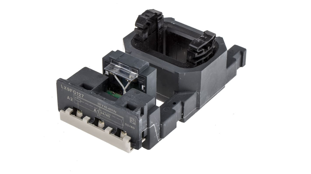 Bobina contattore per uso con LC1F185 e LC1F225, tipo accessori TeSys F, tensione nominale 127 V c.a., frequenza 40-400 Hz, a basso consumo energetico, codice costruttore LX9FG127, marchio Schneider Electric.