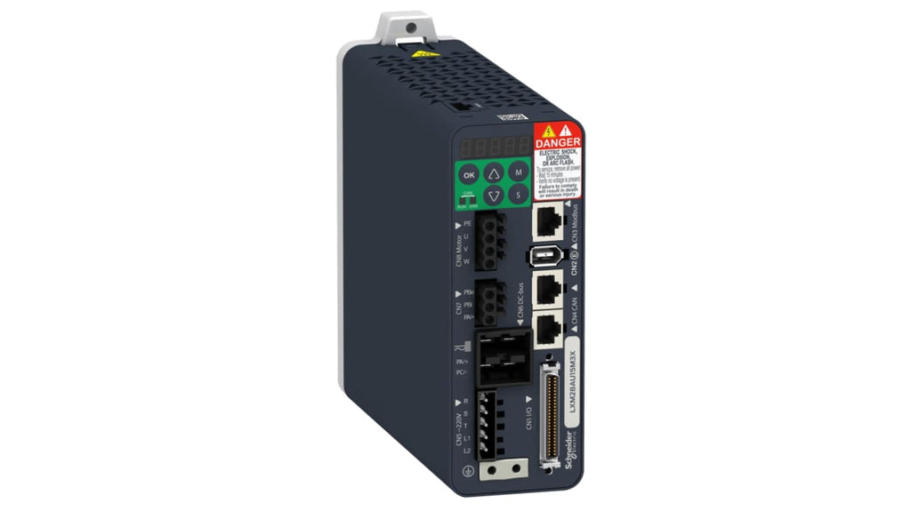Servomeccanismo Lexium 28 di Schneider Electric, 1 fase, potenza nominale 1 kW, tensione 220 V, corrente 8,5 A, feedback dell'encoder, movimento. Dotato di I/O digitali e analogici, interfaccia bus di campo CANopen/CANmotion, identificazione automatica motore, monitoraggio stato, modalità di posizionamento assoluto o relativo, controllo della velocità e della coppia. Dimensioni: 150 mm x 55 mm x 177 mm, temperatura operativa da 0 a 55 gradi Celsius.