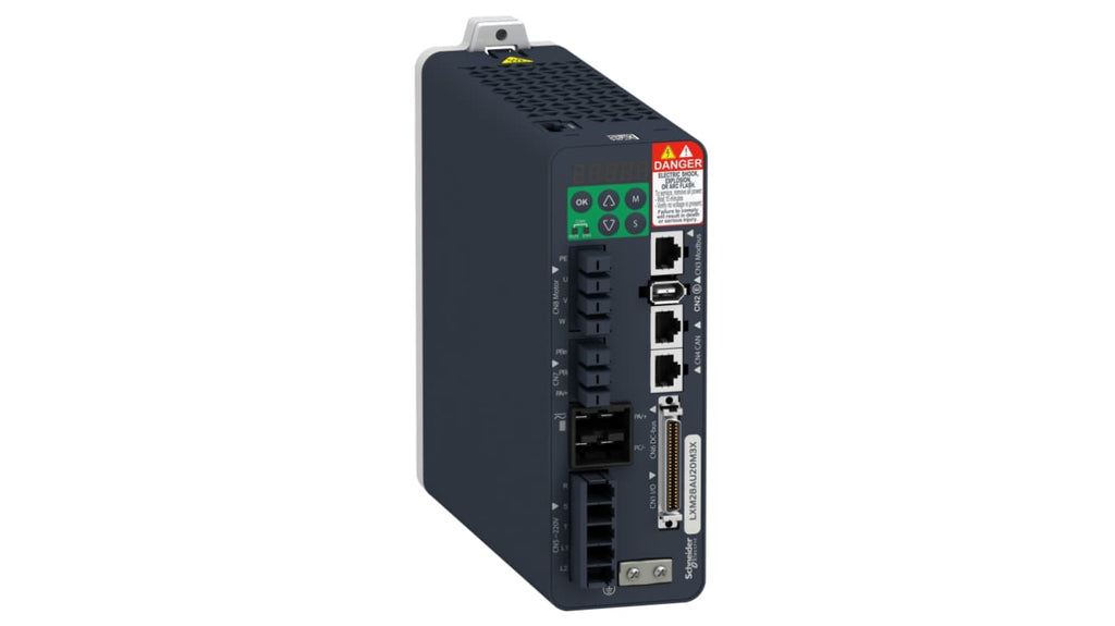 Servomeccanismo Lexium 28 di Schneider Electric, 3 fasi, potenza nominale 2 kW, tensione 220 V, corrente 8,7 A, feedback dell'encoder, movimento. Dotato di I/O digitali e analogici, interfaccia bus di campo CANopen/CANmotion, identificazione automatica motore, monitoraggio stato, modalità di posizionamento assoluto o relativo, controllo della velocità e della coppia. Dimensioni 170 mm x 62 mm x 184 mm, temperatura operativa da 0 a 55 gradi Celsius.
